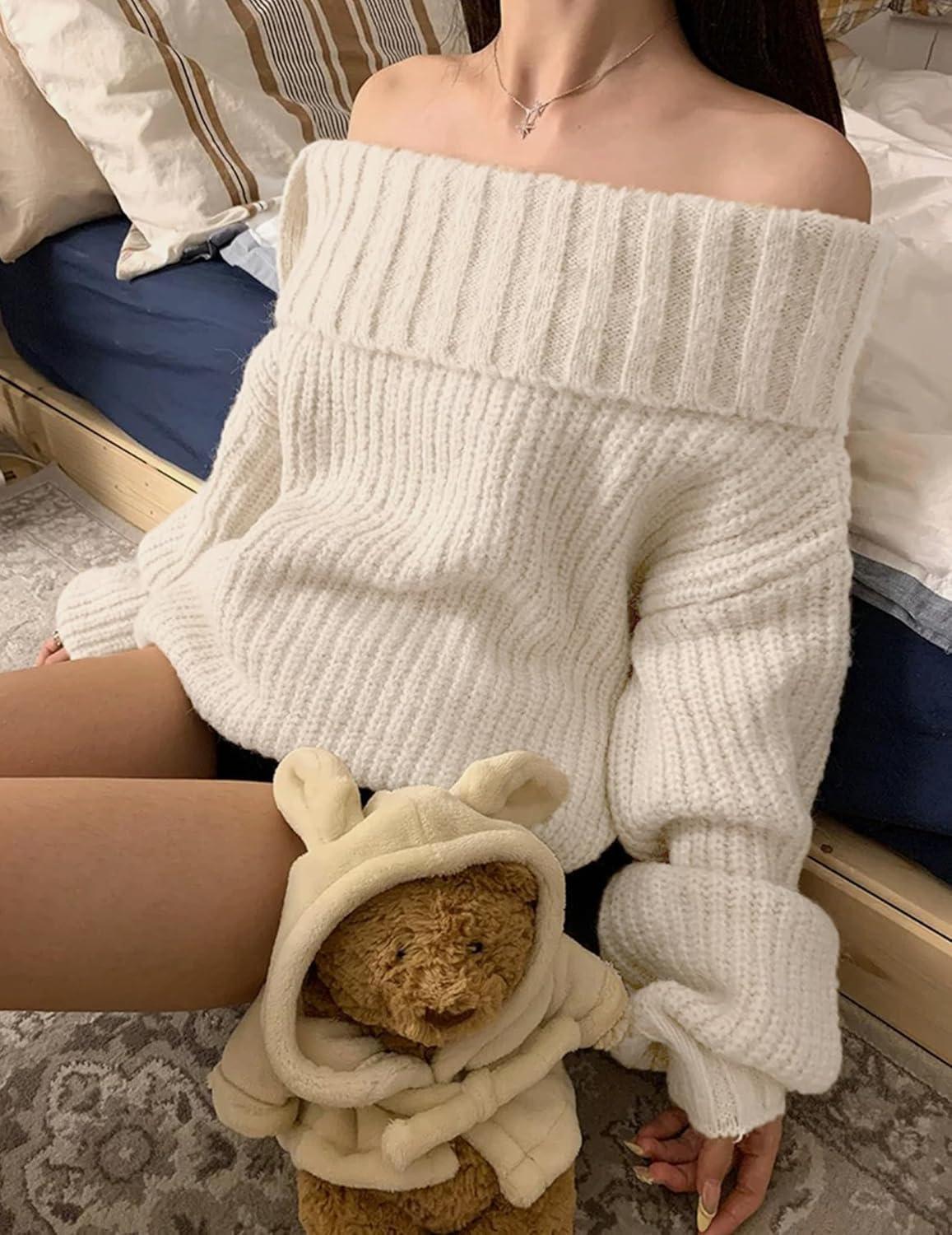 Aelfric Eden Women’s Off-Shoulder Oversized Sweater, Soft Knit Pullover for Trendy Fall & Winter Outfits(Apricot)