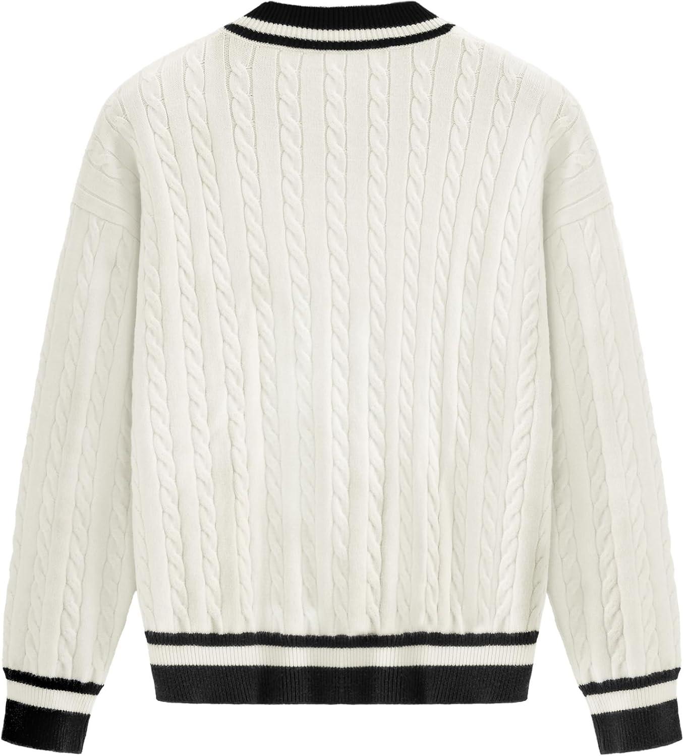 Aelfric Eden Women's Oversized Cable Knit V Neck Sweaters Oversized Pullover 2025 Fall Fashion Outfits(White&dark Blue)